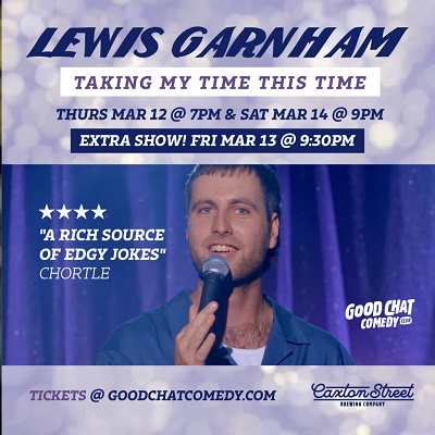 Comedian Lewis Garnham presents his latest stand-up show, delivering observational humour and storytelling in an intimate comedy club setting.